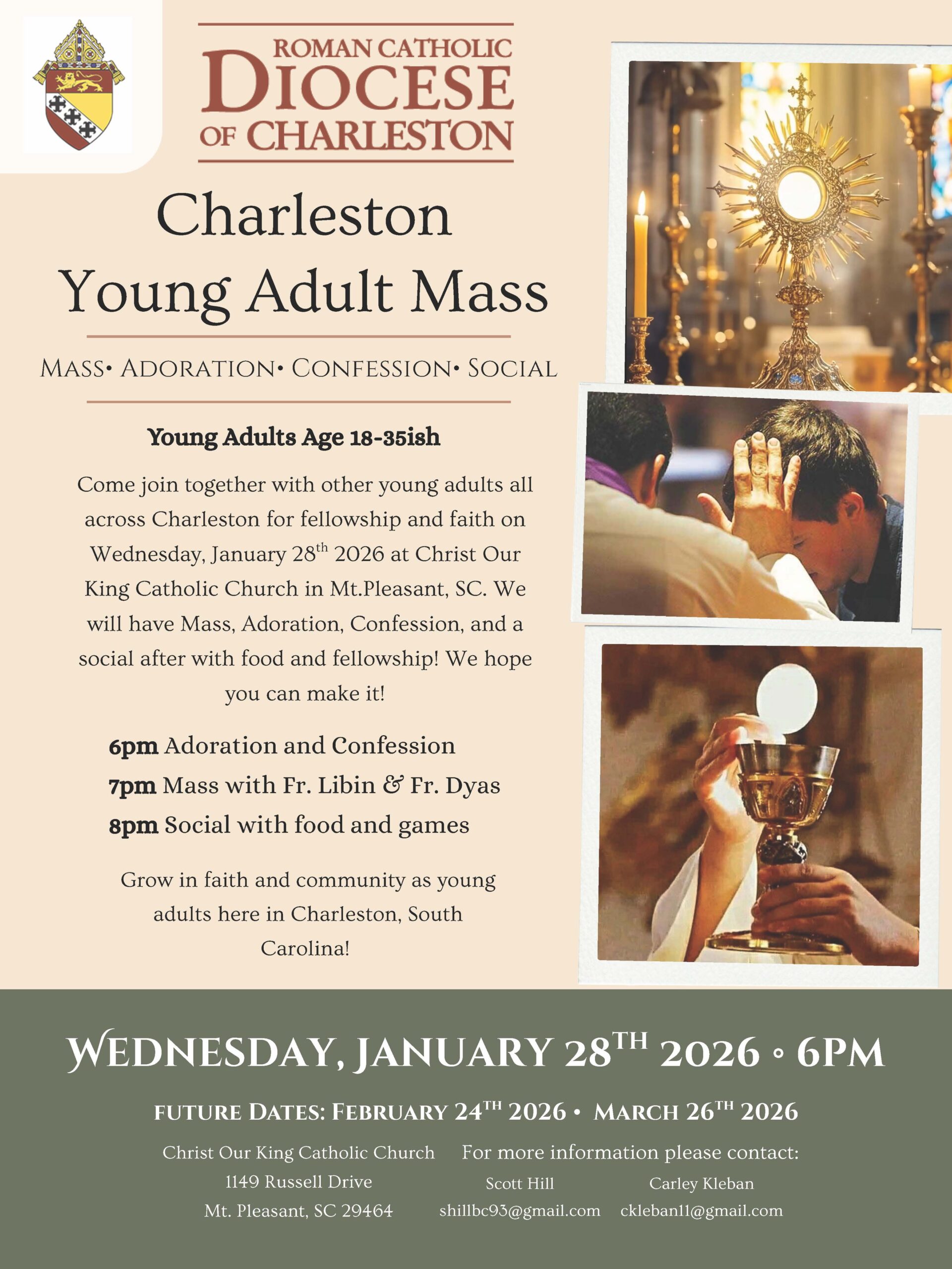 Are you a young adult between 18 and 35 looking for fellowship and growth in your faith? Come to the Young Adult Mass & social!