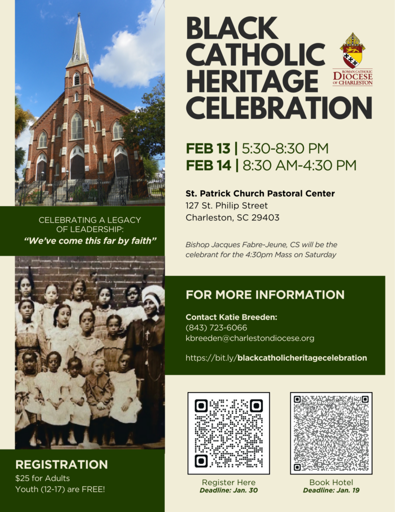 Our spiritual leaders are Deacons Dexter Gourdin and Larry Deschaine, Ph.D. Our guest speaker is Sister Roberta Fulton, SSMN who will speak on the day MLK came to Kingstree, SC. As a young teenager she and her mother had a must talk about experience. Michael Gourdin will demonstrate the diversity of our music in a special tribute. Kathleen Merritt will engage the audience in a open forum on how we’ve come this far by faith and the MLK legacy.