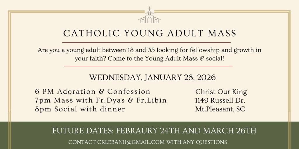 Young adults (ages 18-35), join us at Tommy Condon’s for Theology on Tap! For more information, contact Scott Hill at shillbc93@gmail.com.
