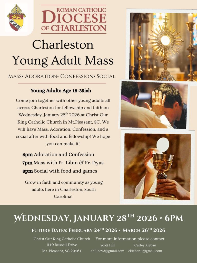 Charleston Young adults 18-35 (21+ to drink alcohol) are invited to our Theology on Tap at Tommy Condon’s in Charleston. Join us at 7:00 p.m. as we discuss faith, share some fellowship, and order a drink — or food if you like!